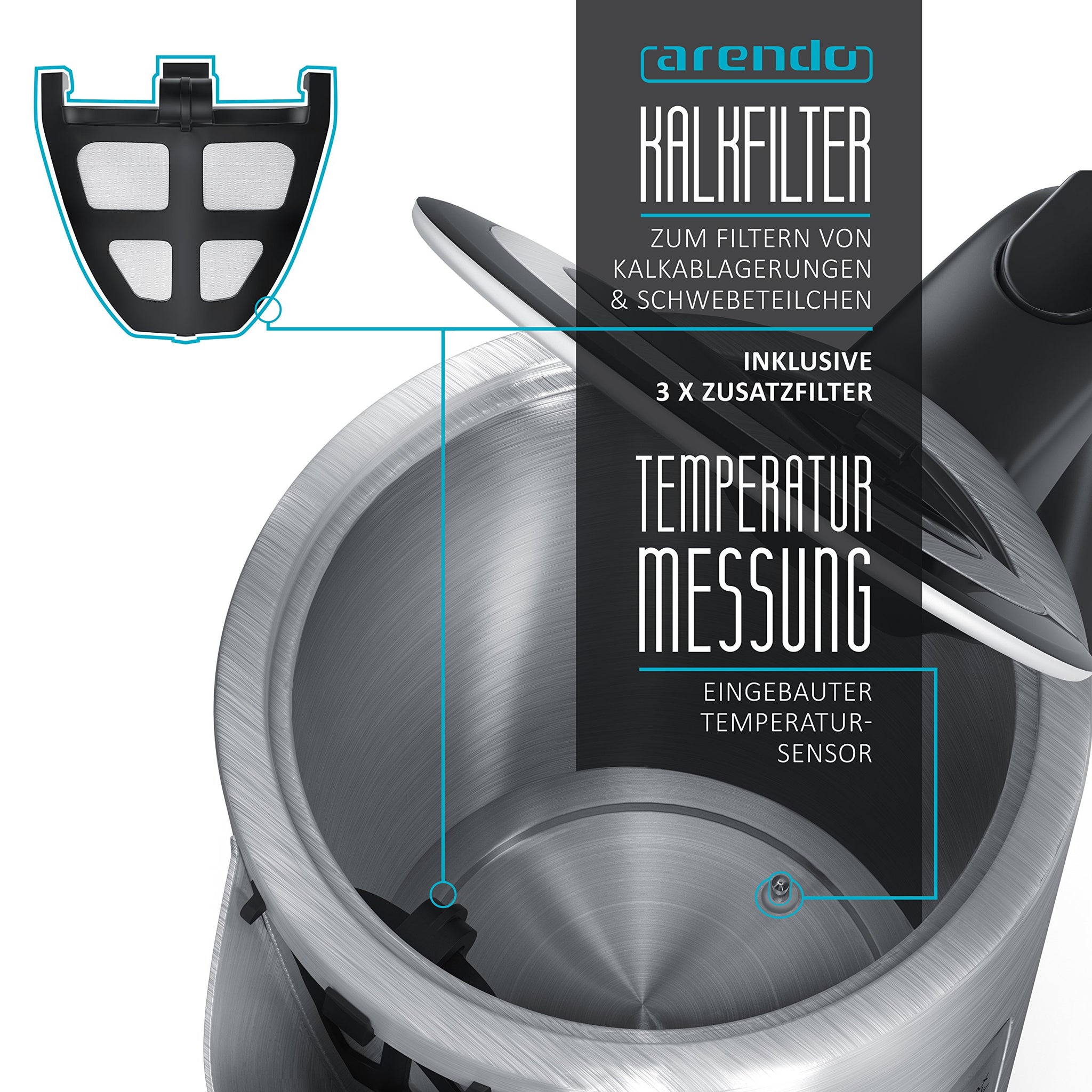 - Arendo Edelstahl-Turbo-Wasserkocher mit Basisstation inkl. vier wählbare Temperaturstufen + Warmhaltefunktions-Taste + On/Off | 302549