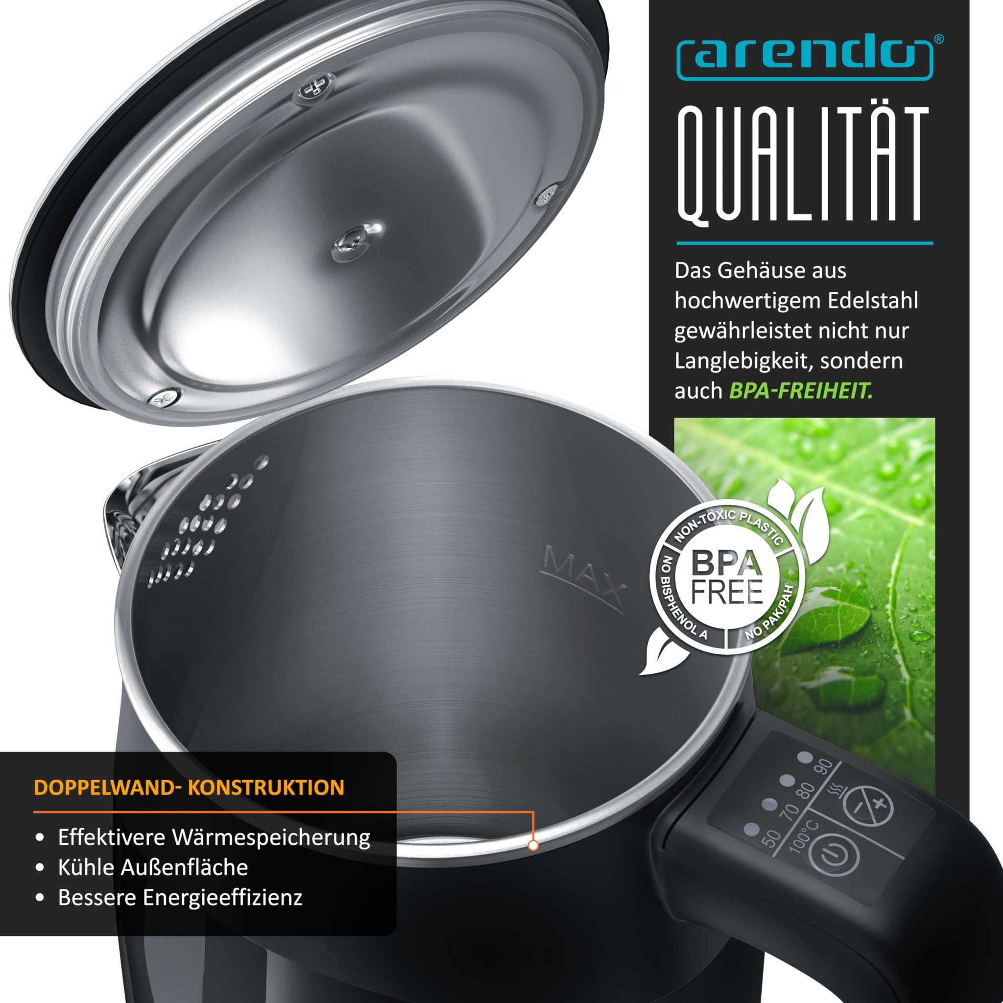 Arendo 0.5l Edelstahl Wasserkocher mit Temperatureinstellung im Doppelwand-Design - 0,5l Wasser-Füllmenge - 5 Temperaturstufen einstellbar - Single Teekocher - Warmhaltefunktion - Energiesparend