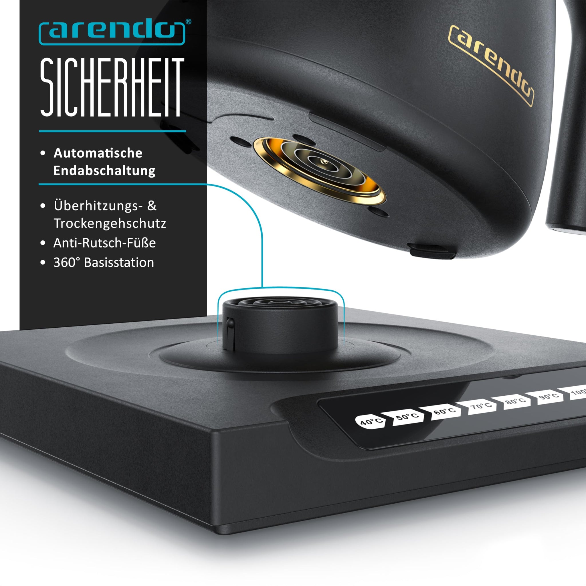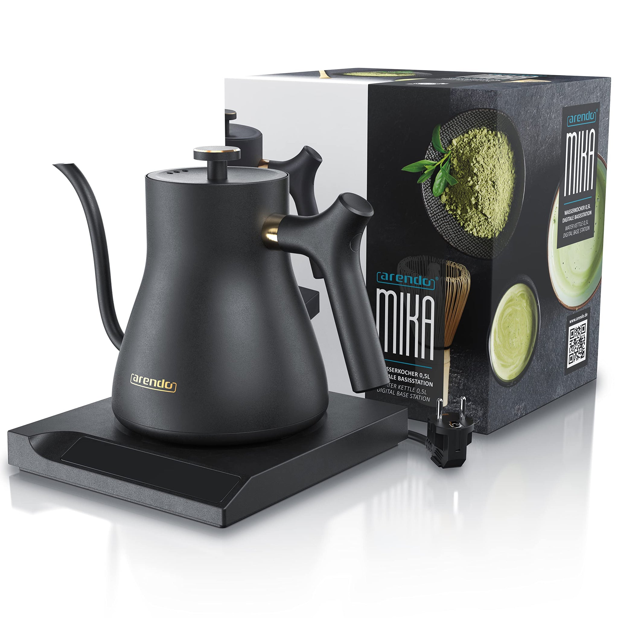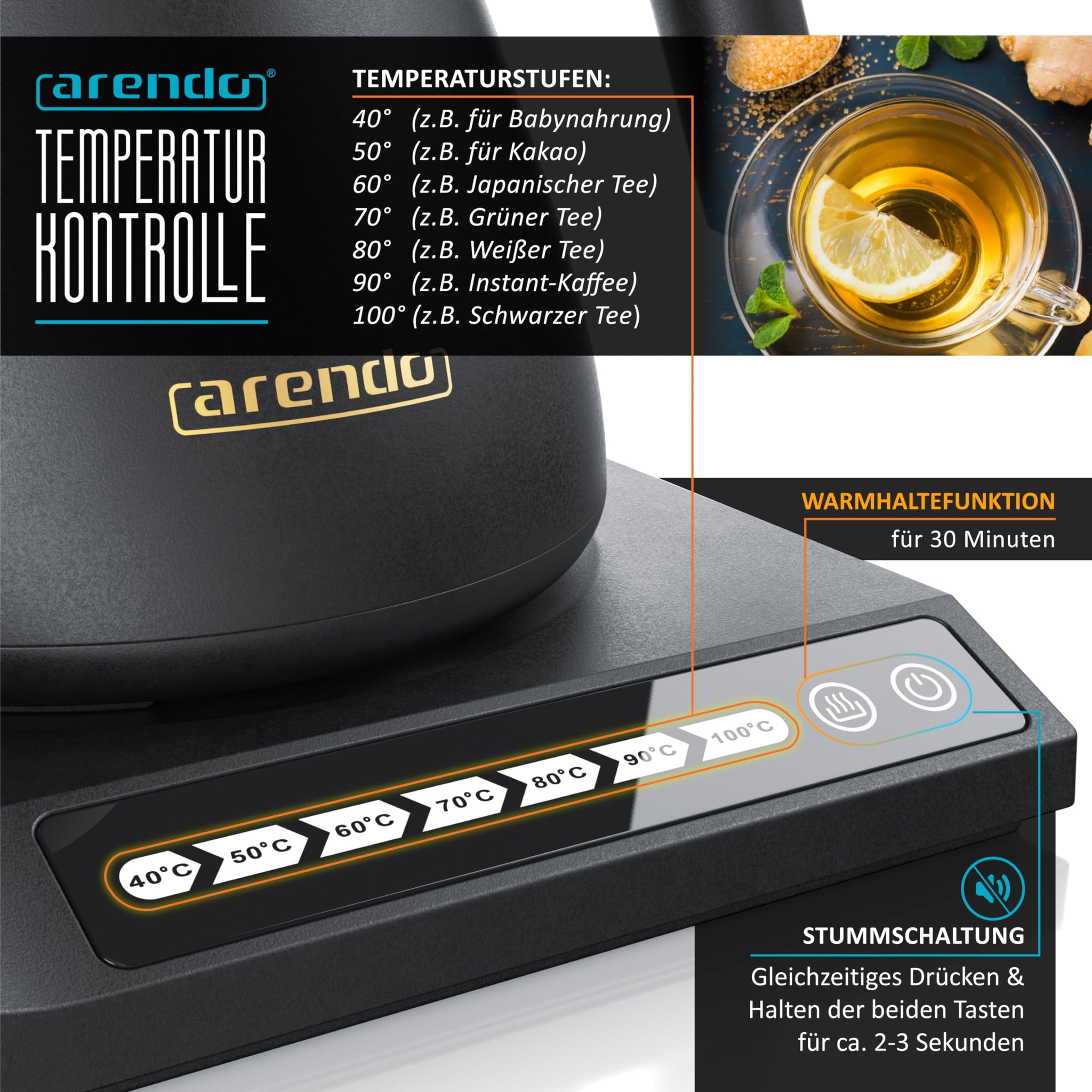 Arendo - Edelstahl Wasserkocher Schwanenhals mit Temperatureinstellung - 40° bis 100° - Warmhaltefunktion 30 Minuten – 0,5 Liter – Sensortasten – 360° Basis - Retro Design - Schwarz
