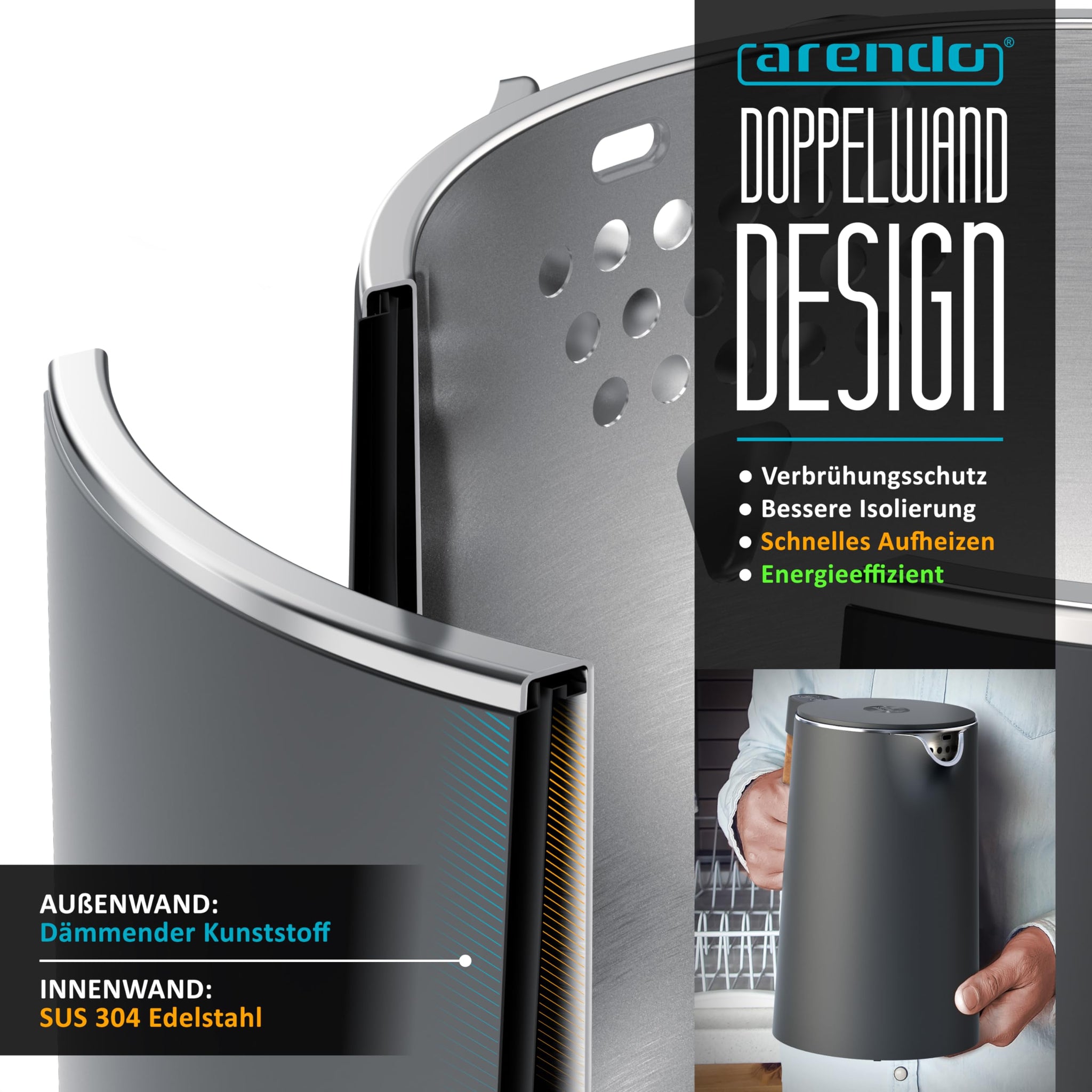 Arendo - Wasserkocher Edelstahl mit Temperatureinstellung - 45°C-100°C - 1.5 Liter - Doppelwand - BPA frei - Warmhaltefunktion - Teekocher mit Temperaturanzeige - Griff Cool Touch - Schwarz Cool Grey